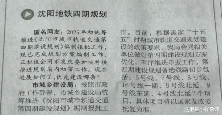 (图片来源于话沈阳公众号截图)很多关注沈阳地铁的热心市民都知道针对沈阳地铁第四期建设规划的回复已经快一年多都没有什么变化了,一直卡在省内初审阶段。这次最新的回复在具体措辞上有所改变,同样提到了国家“十五五”时期城市轨道交通规划建设的政策要求,但是线路没有变化,依然这是之前二次公示的那样,包含5号线、7号线、8号线、16号线一期、9号线北延、9号线东延、4号线北延7个项目。沈阳市城市轨道交通第四期建设规划(2025-2030年),是沈阳市城乡建设局于2023年6月公示的城市轨道交通建设规划。该规划于2021年6月完成招标工作,2022年2月启动编制,2023年3月,规划进行第一次环境影响评价公示,包含8个项目,总规模约200公里;同年6月,规划重新公示,包含K1快线一期、K2快线一期、5号线一期、7号线一期、16号线一期、2号线支线、4号线北延、9号线北延共8个项目,总规模约218.5公里。
